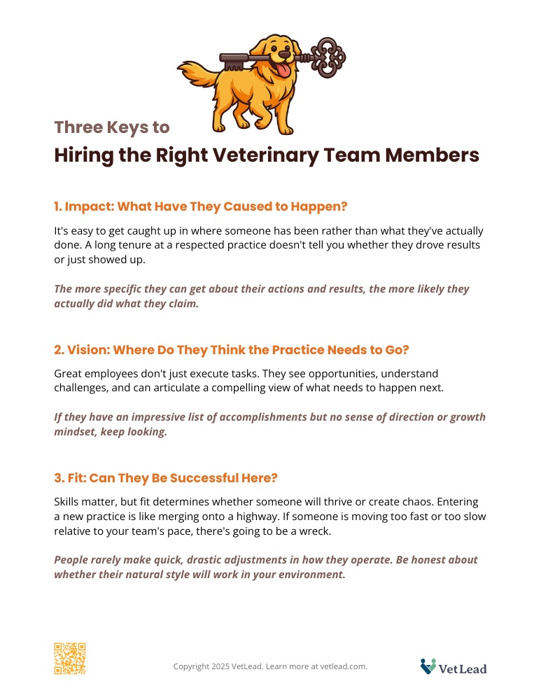 The veterinary hospitals that break out of this cycle stop feeling held hostage by struggling team members. They have a process that can bring in people who are really good, not just at technical aspects, but at showing up, contributing, and helping build the team everyone wants to be part of.